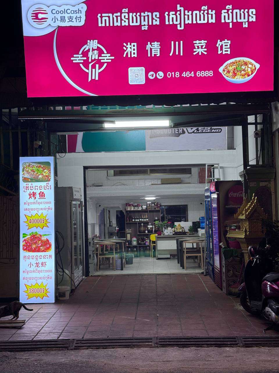 本店做川湘菜 ,烧烤, 设备全新齐全,有2个大像平台。 2个柬单点平台 1个Grab平,正常营业中, 房屋2年合同,押金2个月,店5米×20米。 楼上2间套房都带卫生间,飞机聊0978726999。 不接电话!转让价格详谈!