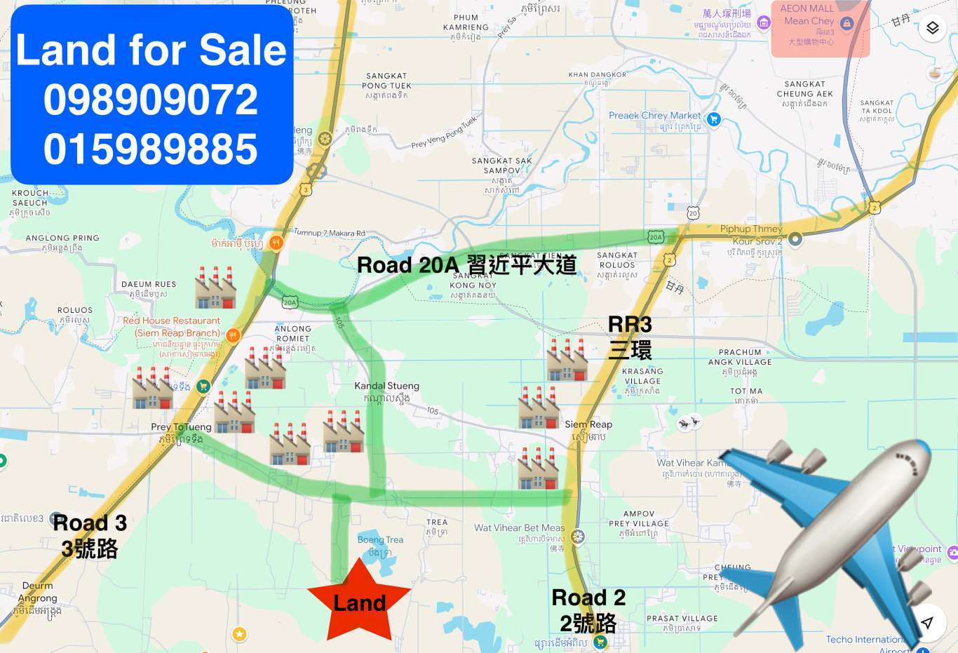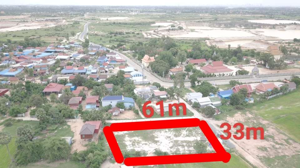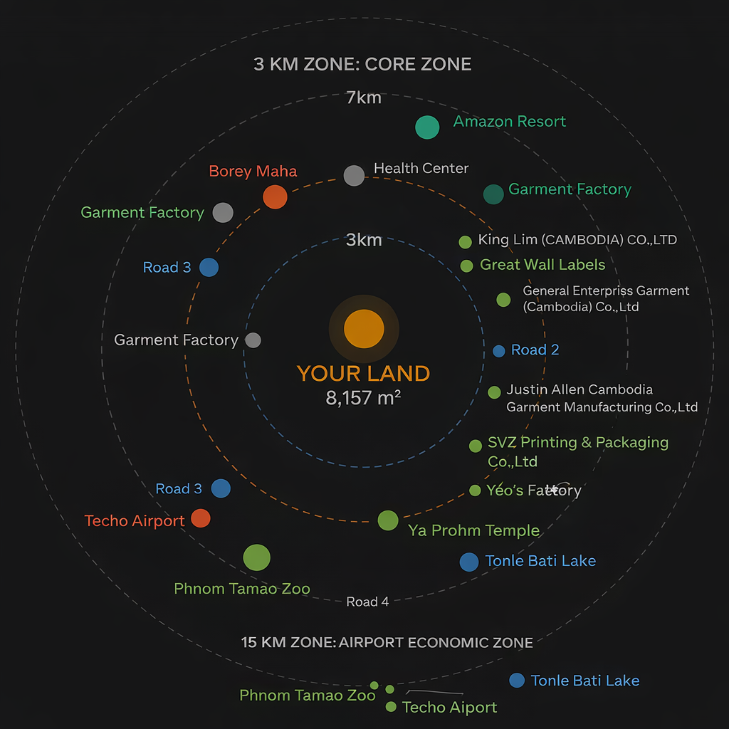 這塊土地大約 2,400 平方米,位置在金邊南部,距離新機場約 14–15 公里,同時連接第三環狀線、2 號路、3 號路、105 路、20A 路,整體位置不錯。